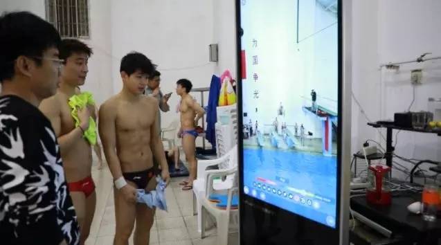 ▲跳水队员正通过大屏观看跳水回放