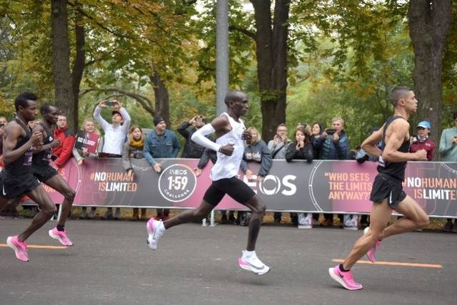 在天时地利人和的环境下,基普乔格不负众望,10公里用时28分28秒,20公里用时56分47秒,最终以1小时59分40秒的成绩成功“破2”。不过由于此项挑战由赞助商支持,因此这一成绩不被国际田联官方承认。