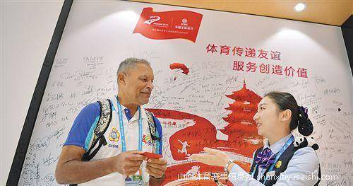 中国工商银行业务员为外宾提供金融服务。针对“村民”多国家、多语言、多军人的特点,工行军运村服务点的建设和服务突出了国际化、智慧化特色。