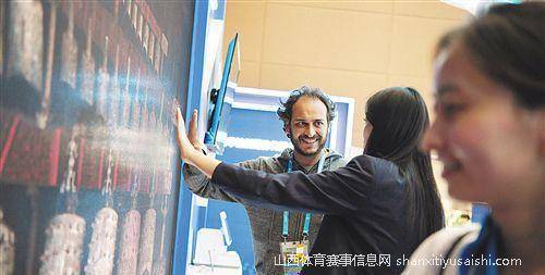 在军运会主媒体中心5G传播创新实验室,来自巴西的媒体记者通过5G+AR体验编钟演奏。
