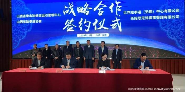 11月10日,山西省拳击跆拳道运动管理中心、山西省跆拳道协会和世界跆拳道(无锡)中心、新跆联无锡赛事管理有限公司在山西体育中心举行合作签约仪式。山西省体育局局长赵晓春、山西省体育局副巡视员程中平、山西省拳击跆拳道运动中心主任胡文戈参加了签约仪式。正式确立了基于教育培训、会员管理、协会实体化改革和跆拳道发展专项基金四个工作模块的合作关系。