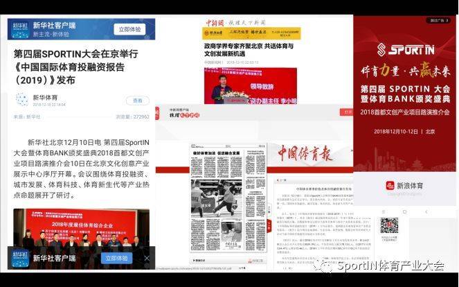通过咪咕直播、新浪直播、企鹅直播、央视影音、爱奇艺等10家直播平台在线观看大会的人数总计超26.5万。除此之外,日均PV超1.2亿的新浪体育PC端在其首页BANNER条位置对大会主视觉进行曝光;拥有超300万日活用户的新浪体育APP在其开屏页面对大会进行了宣传推广。除此之外,参会嘉宾、大咖包括刘建宏、谢杏芳等知名体育意见领袖、关键人士均通过微博、微信等自媒体平台曝光了活动信息,引发行业众多人士的关注。