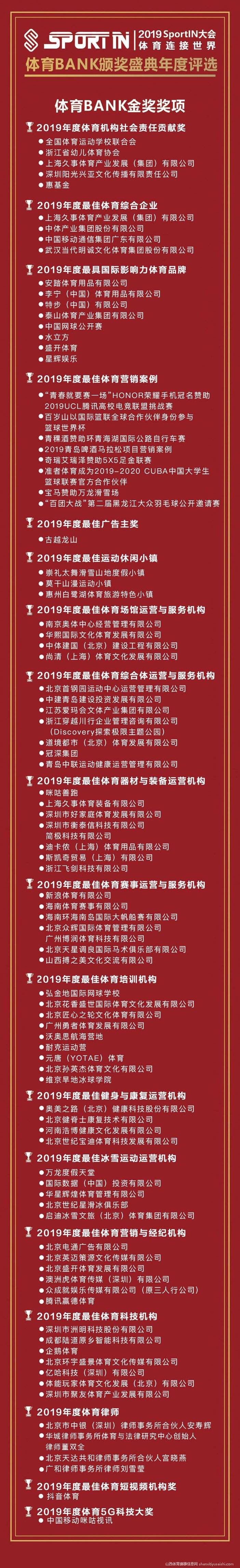 此次大会还揭晓了2019年度体育产业大奖,包括年度金奖类、赛事类、投资类、儿童体育类四大类共计37项大奖。据悉,本次评选是经过组委会,依托媒体影响力,智库调研,专家评审等方式进行的行业调研和深度访谈而产生,确保了参评项目的广泛性及评选结果的专业性,以下为奖项榜单。