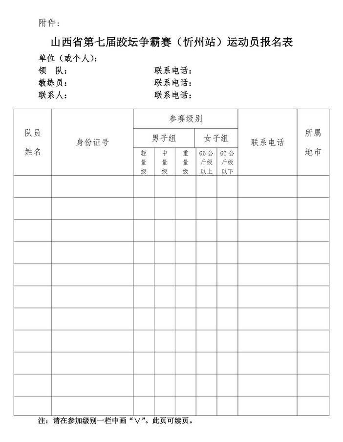 山西省第七届跤坛争霸赛(忻州站)运动员报名表