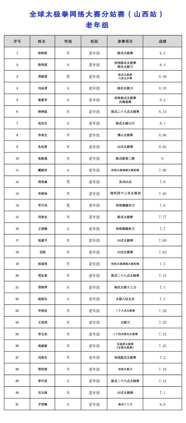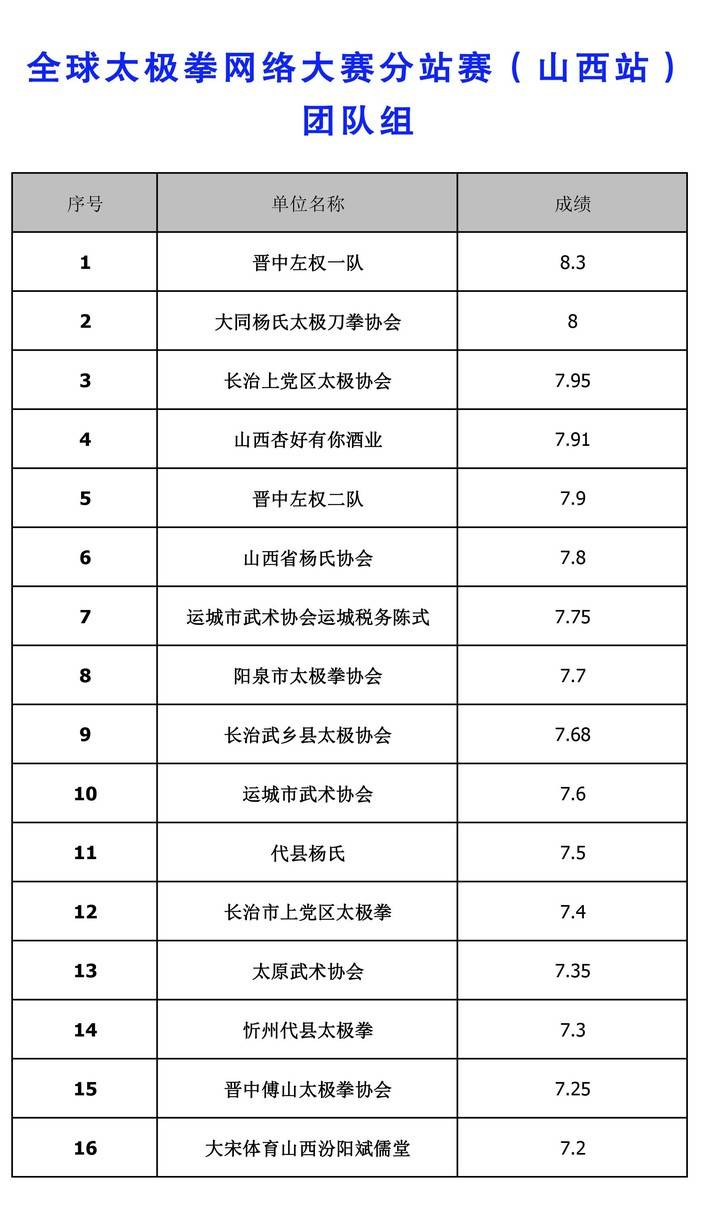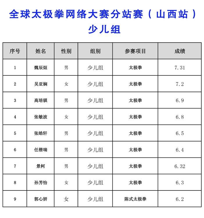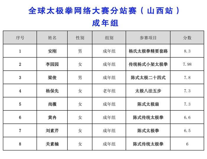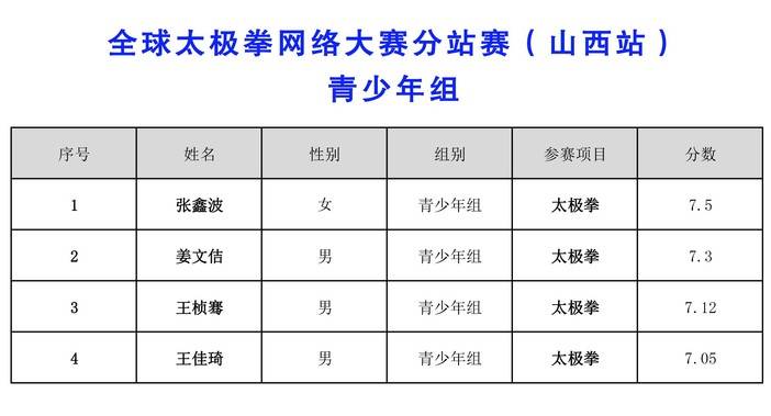 全球太极拳网络大赛分站赛(山西站)-成绩公告