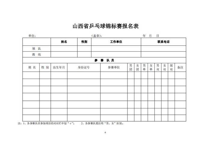 (一)参赛运动员以市体育局为单位统一报名,每队可报领队1人,教练员2人。团体赛每队可报运动员5人,单项赛报名人数不限。