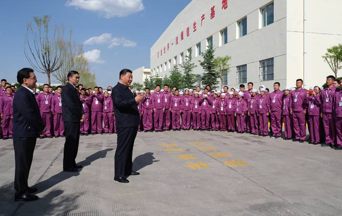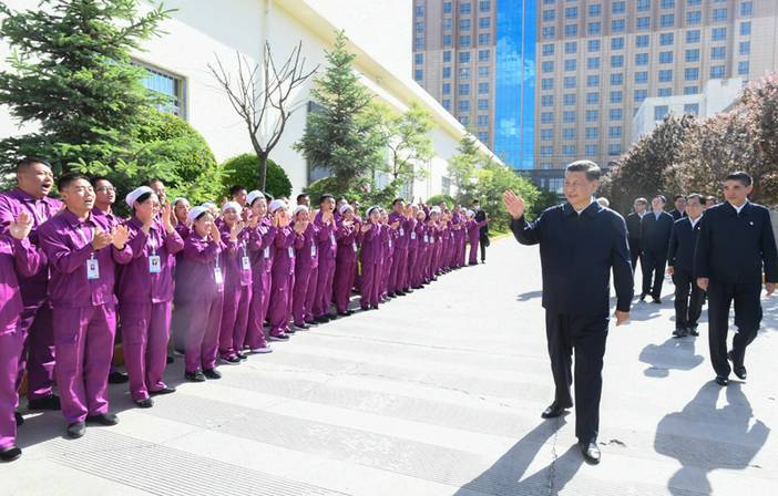 6月7日至9日,中共中央总书记、国家主席、中央军委主席习近平在青海考察。这是7日下午,习近平在青海圣源地毯集团有限公司考察时,向企业职工挥手致意。新华社记者 李学仁 摄