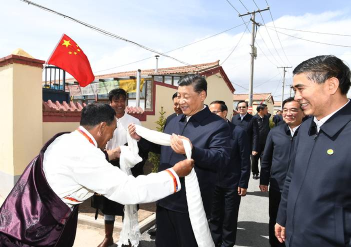 6月7日至9日,中共中央总书记、国家主席、中央军委主席习近平在青海考察。这是8日下午,习近平在海北藏族自治州刚察县沙柳河镇果洛藏贡麻村考察时,藏族牧民索南才让向习近平献上哈达。新华社记者 谢环驰 摄