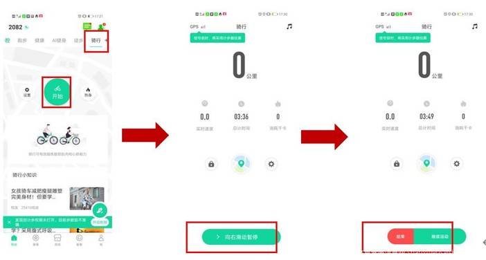 3、骑行结束后,向右滑动下方绿色按钮,暂停或结束运动。