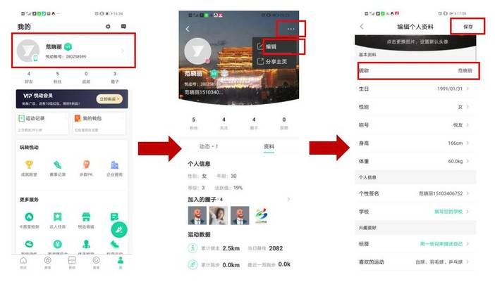 《悦动圈》昵称修改方法:悦动圈APP→右下角我→点击默认账号右侧箭头→点击右上角三点→点击编辑→修改昵称等信息→点击右上角保存。