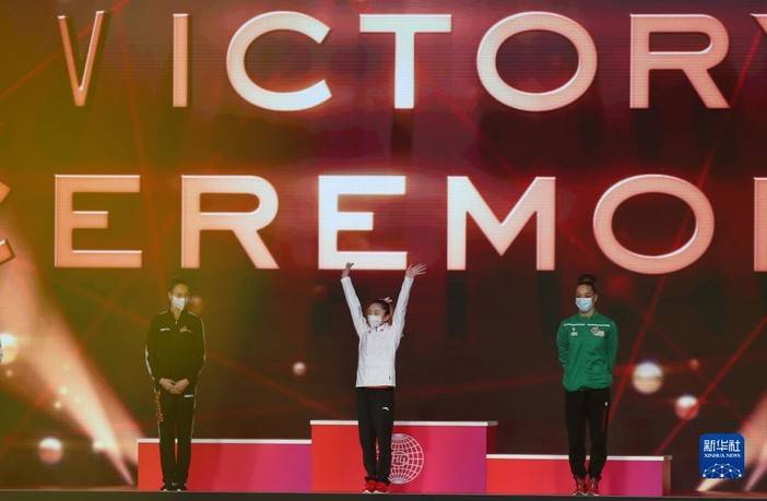 10月21日,获得女子个人全能决赛第六名的中国选手韦筱圆(中)向观众致意。