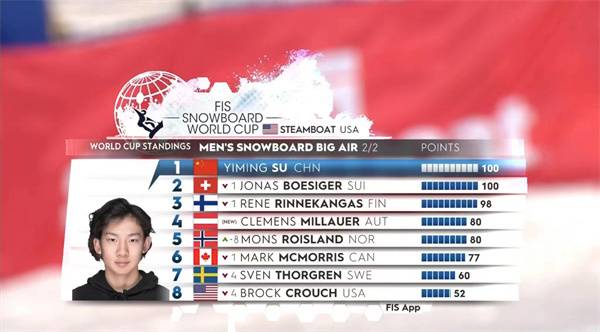 决赛中苏翊鸣以两轮总分155.25分的成绩拿到金牌,奥地利选手米尔拉尤尔以139.50分获得亚军,挪威名将罗塞兰以134分获得季军。