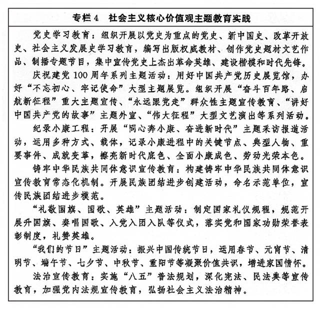 持续深化社会主义核心价值观宣传教育,增进认知认同、树立鲜明导向、强化示范带动。坚持贯穿结合融入、落细落小落实,把社会主义核心价值观要求融入日常生活,融入法治建设。推动理想信念教育常态化制度化,筑牢党员干部、青少年等重点群体的理想信念之基。围绕“七一”、“八一”、“十一”等重大时间节点,依托革命历史类纪念设施、遗址和爱国主义教育基地等载体,加强爱国主义、集体主义、社会主义教育,弘扬党和人民在各个历史时期奋斗中形成的伟大精神。加强公益广告宣传。统筹开展诚信教育、勤俭节约教育、劳动创造幸福主题宣传教育。强化祖国统一和民族团结进步宣传教育,深化“一国两制”实践教育,强化全民国防教育,促进平安中国建设。