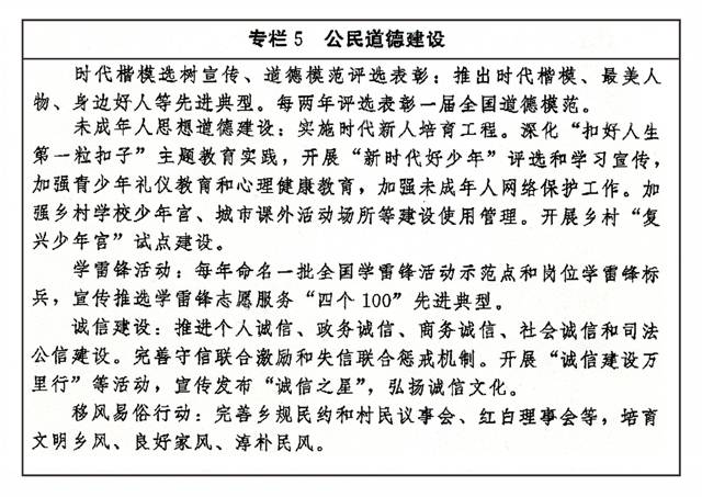 传承弘扬中华传统美德,加强社会公德、职业道德、家庭美德、个人品德建设,加强家庭、家教、家风建设。加强对革命、建设、改革时期各类先进典型的学习宣传,尊崇褒扬英雄模范,关心关爱先进典型人物。健全家庭、学校、政府、社会相结合的思想道德教育体系,把立德树人贯穿学校教育全过程。发挥优秀文化产品陶冶道德情操的作用,完善市民公约、乡规民约、学生守则、团体章程等社会规范,广泛开展弘扬时代新风行动,深化道德领域突出问题治理。加强农村思想道德建设,创新文化科技卫生“三下乡”长效机制。