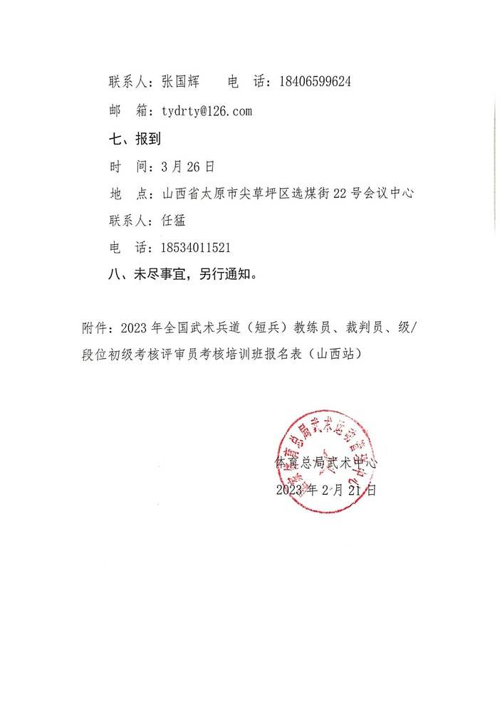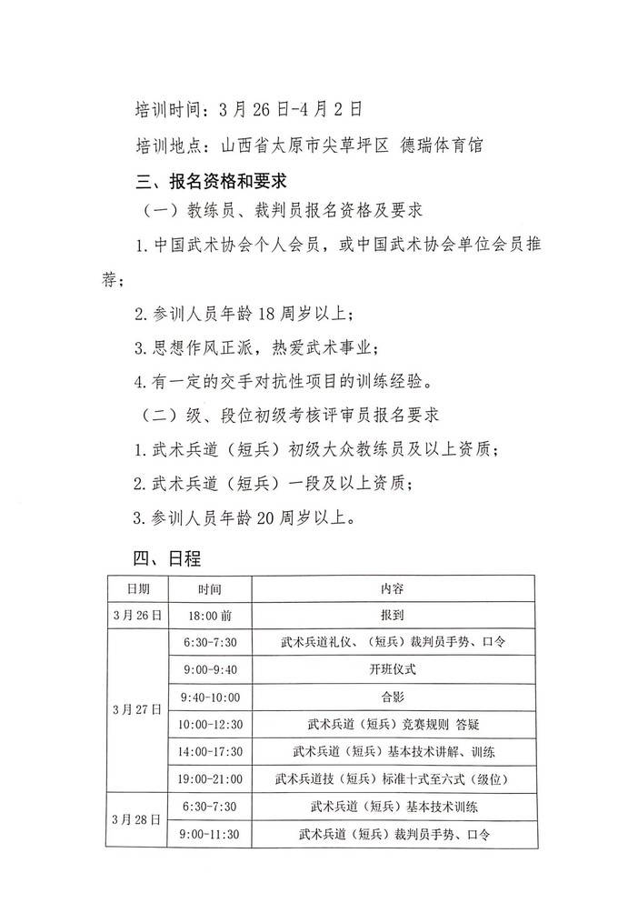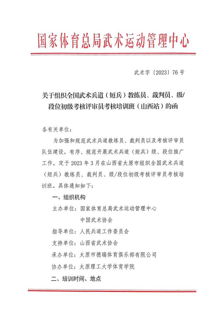 关于组织全国武术兵道(短兵)教练员、裁判员、级/段位初级考核评审员考核培训班(山西站)的函