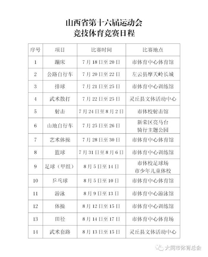 山西省第十六届运动会竞技体育和群众体育各项赛事自开赛以来,吸引众多体育爱好者的关注。本届省运会设竞技体育和群众体育两个组别,其中,竞技体育设26个大项37个小项,大同市共承办15个大项22个小项。群众体育共设22个大项,大同市承办9个大项的比赛。