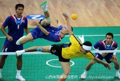 藤球产生于马来地区,是新加坡、马来西亚、印度尼西亚等国家的传统体育项目,在东南亚地区广泛流行。藤球是一项运用脚腕、膝关节等部位同时夹、顶球,不让球落地的运动,类似我国民间的踢花毽子。藤球跟排球比赛有些类似,所不同的是以脚代手,所以又叫“脚踢的排球”。在新德里1982年第9届亚运会,藤球作为表演项目亮相,在北京1990年第11届亚运会上,藤球成为正式比赛项目。藤球场地长13.4米,宽6.1米,场地上空8米内,场地四周3米内不得有障碍物。球网中间位置的顶端,男子不低于1.52米,女子不低于1.42米。球为圆形空心球,用天然藤条或塑料条编成。