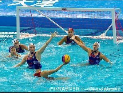 水球源于英国,有“水上足球”之称。比赛一般设在人工游泳池,男子标准比赛场地长30.6米、宽20米,女子标准比赛场地长25.6米、宽20米,水深至少1.8米。场地两端各有一个高0.9米、宽3米的球门,球门框涂成白色。比赛场地边线设置彩色浮标,白色为球门线和中线,球门两侧与边线处的红色浮标均表示2米内区域,其各自延长线于门前“交汇”区域为球门区,即越位区域;黄色浮标表示6米内区域;黄色浮标内的红色标记为5米线位置,即执行5米罚球的对应位置。