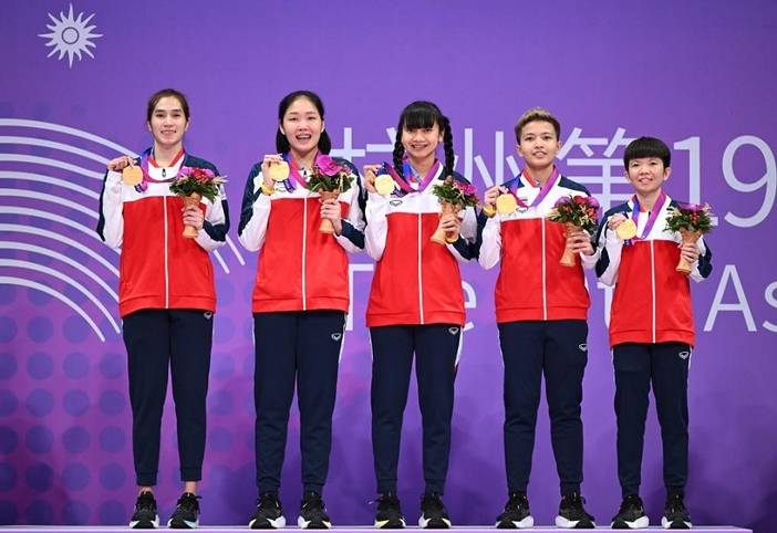 中国女排也在书写新历史。当天她们在女排决赛中3:0击败日本队,以六战全胜卫冕亚运会冠军,第九次摘得亚运金牌。
