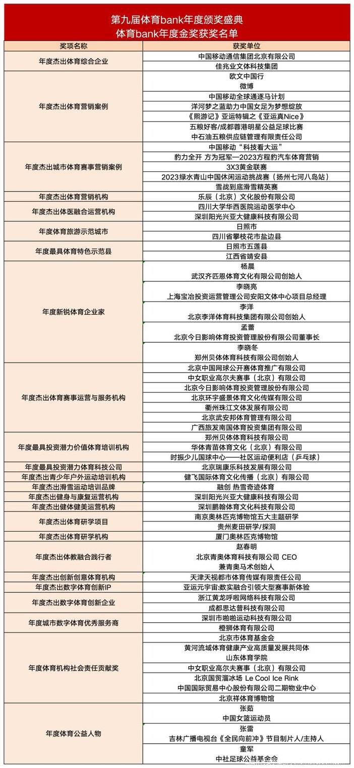 “年度金奖”作为体育BANK年度评选历年来持续评选奖项,一直是参选热门。此次年度金奖评选出包括年度杰出体育综合企业、年度杰出体育营销案例、年度杰出城市体育赛事营销案例、年度杰出体育营销机构、年度杰出体医融合运营机构、年度体育旅游示范城市、年度最具体育特色示范县、年度新锐体育企业家、年度杰出体育赛事运营与服务机构、年度最具投资潜力价值体育培训机构、年度最具投资潜力体育科技公司、年度杰出青少年户外运动培训机构、年度杰出滑雪运动培训品牌、年度杰出健身与康复运营机构、年度杰出健体健美运营机构、年度杰出体育研学项目、年度杰出体育研学机构、年度杰出体教融合践行者、年度杰出创新创意体育机构、年度杰出数字体育创新IP、年度杰出数字体育创新企业、年度城市数字体育优秀服务商、年度体育机构社会责任贡献奖、年度体育公益人物等24大奖项。中国移动通信集团北京有限公司、佳兆业文体科技集团摘获年度杰出体育综合企业。