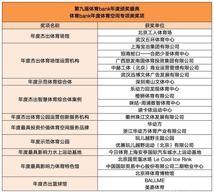 体育空间专项类奖项则颁发了年度杰出体育场馆、年度杰出体育场馆运营机构、年度示范体育综合体、年度杰出智慧体育综合体案例、年度杰出体育公园运营创新服务机构、年度最具投资价值体育空间服务品牌、年度示范体育公园、年度最具影响力水上运动基地、年度最具影响力体育特色馆、年度杰出篮球馆等10大奖项。北京工人体育场、武汉五环体育中心获得年度杰出体育场馆。