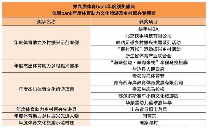 此次年度评选同时角逐颁发了体育助力文化旅游及乡村振兴专项奖,北京快手科技有限公司的快手村BA、咪咕足球乡村振兴主题系列活动、浙江省体育产业联合会的“百村万帐”运动振兴乡村活动摘获年度体育助力乡村振兴示范案例。专项奖同时颁发了年度杰出体育助力乡村振兴赛事、年度杰出体育文化旅游项目、年度体育助力乡村振兴先进县、年度体育助力乡村振兴先进人物、年度体育文化旅游示范村庄等奖项。