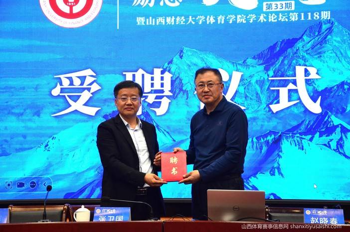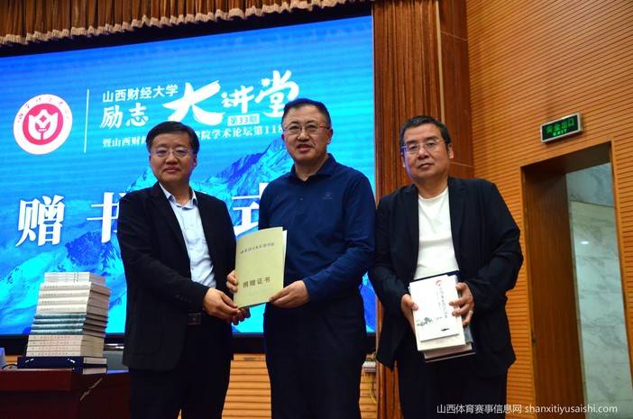 在讲座前举行了赠书仪式,赵晓春局长向山西财经大学赠送书籍《体育的中国化与现代化——以运动项目为中心》《何处是远方》《我的母亲》《半日闲斋古体诗存》共计23本,还举行了受聘仪式,张卫国副校长向赵晓春局长颁发了“山西财经大学创业导师证书”。另外还进行了签约仪式,山西财经大学创业学院院长史成安与山西搏之美文化交流有限公司董事长王刚签订了《山西搏之美文化交流有限公司 山西财经大学创业学院战略合作协议》。
