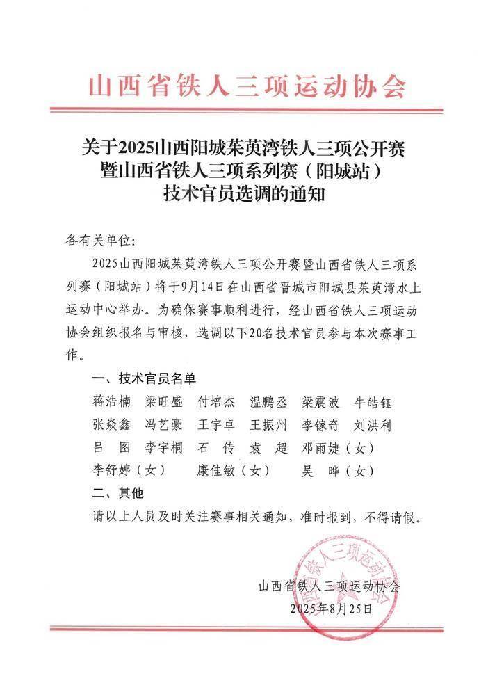 关于2025山西阳城茱萸湾铁人三项公开赛暨山西省铁人三项系列赛(阳城站)技术官员选调的通知
