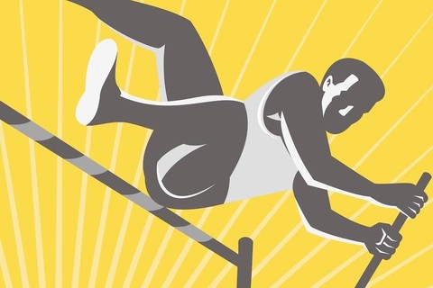 ①跳高要求运动员单足起跳,要跳过横杆且不能将其碰下支撑杆。每次比赛由主裁判设定起始高度,跳高横杆每轮至少升高2厘米,直到剩下最后一人。跳高运动员可以自己选择何时起跳或过杆。他们假如三次试跳同一高度失败就会被淘汰。他们成功越过的最高高度就是他们的最终成绩。