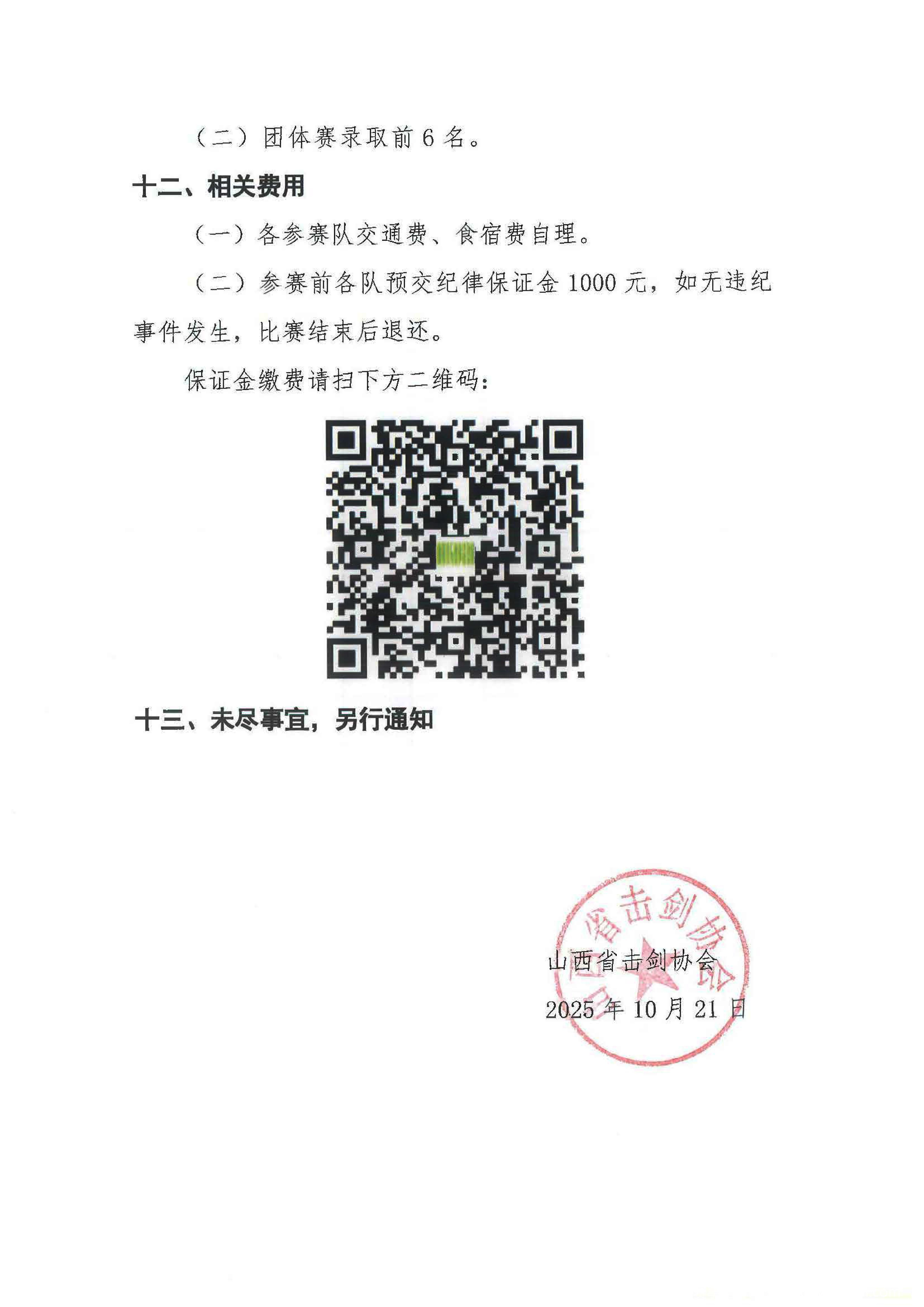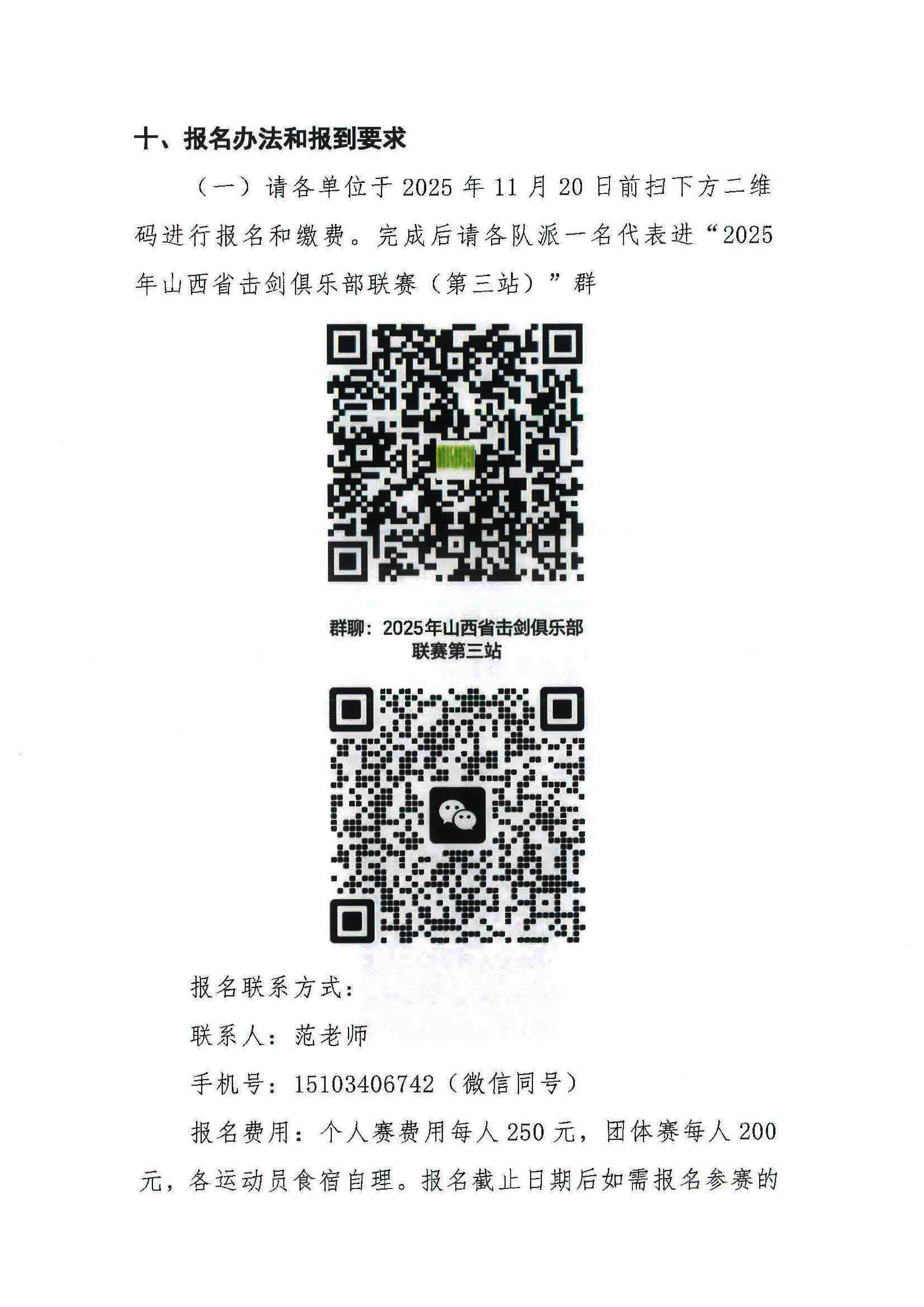 (一)请各单位于2025年11月20日前扫下方二维码进行报名和缴费。完成后请各队派一名代表进“2025年山西省击剑俱乐部联赛(第三站)”群