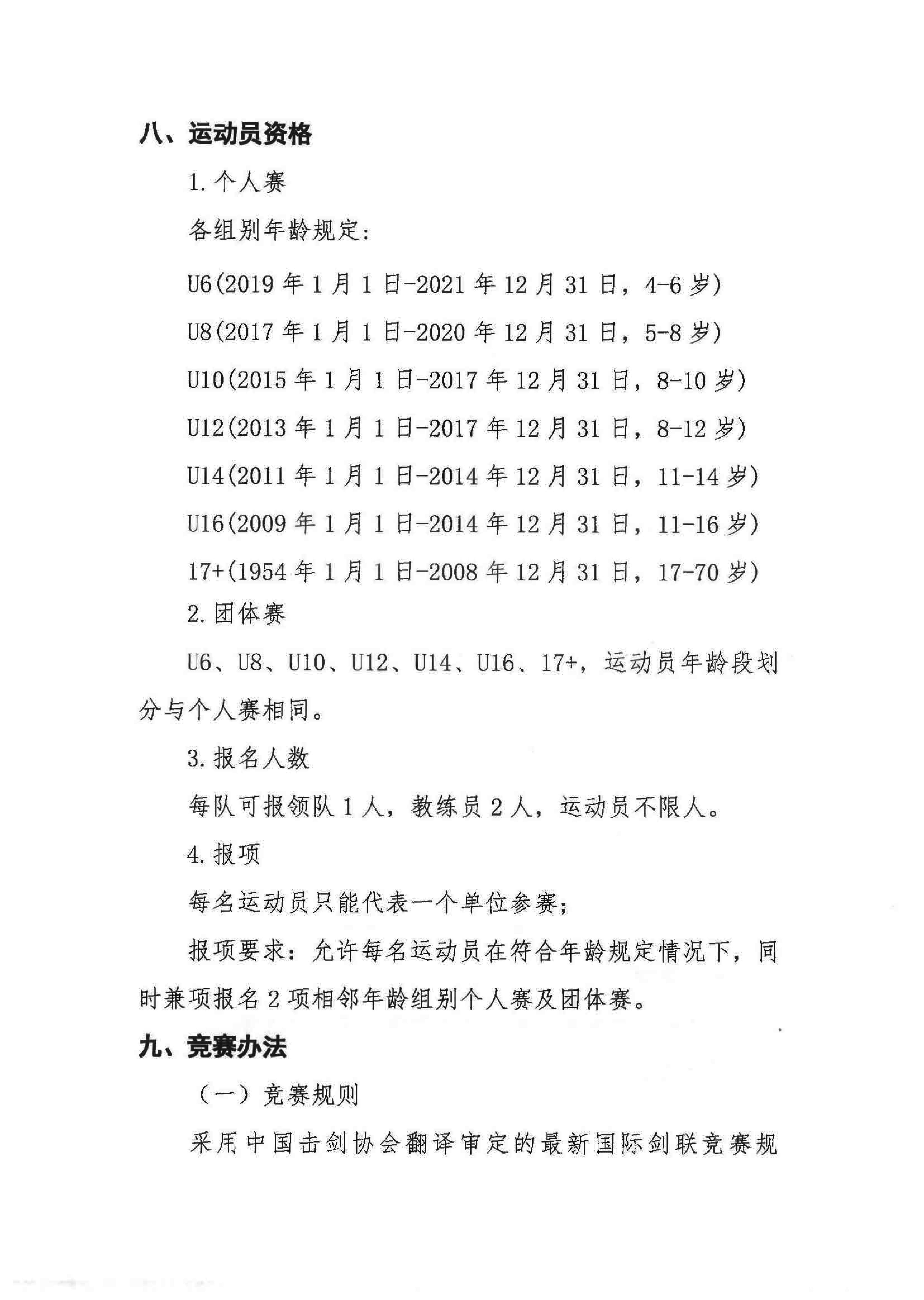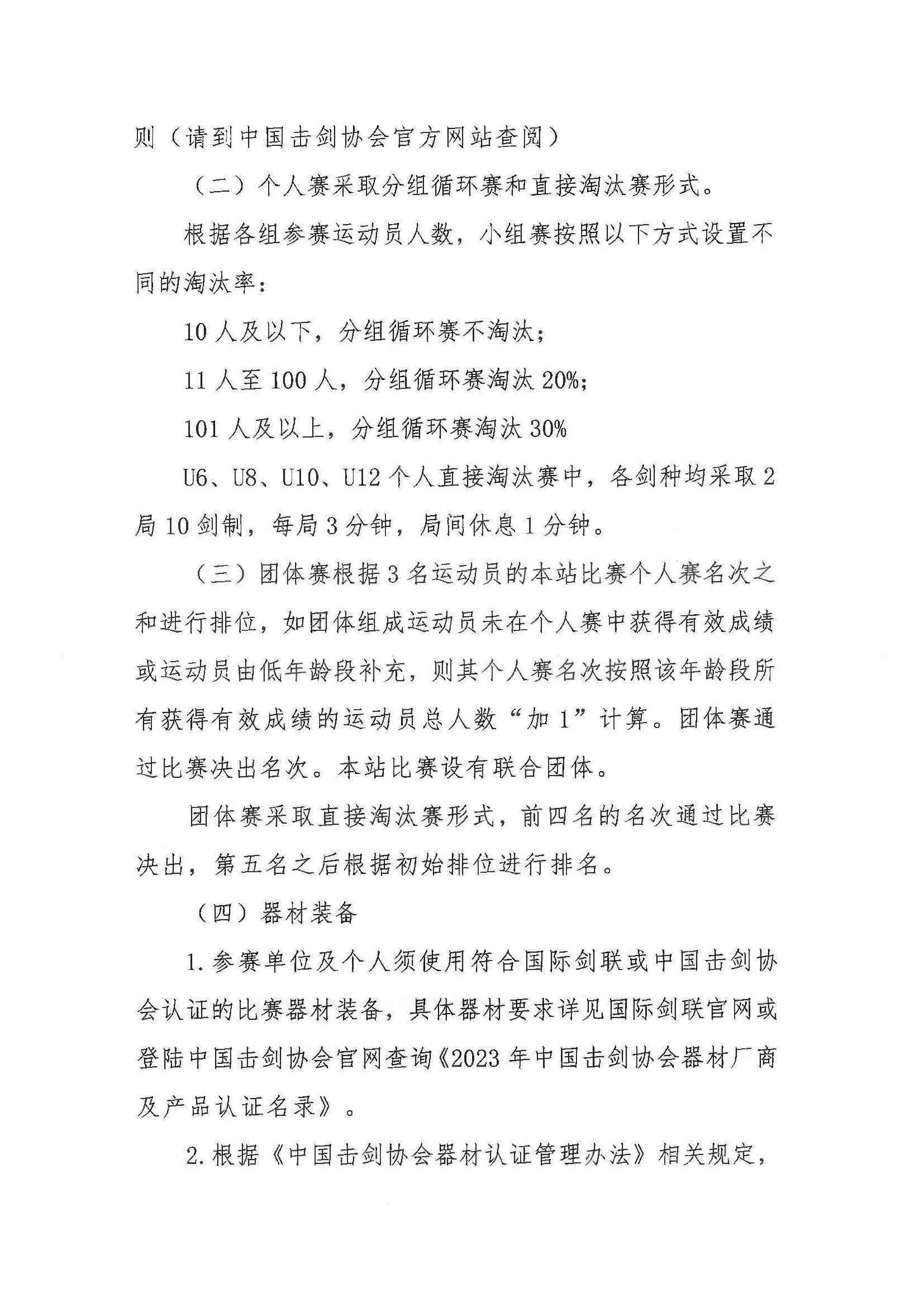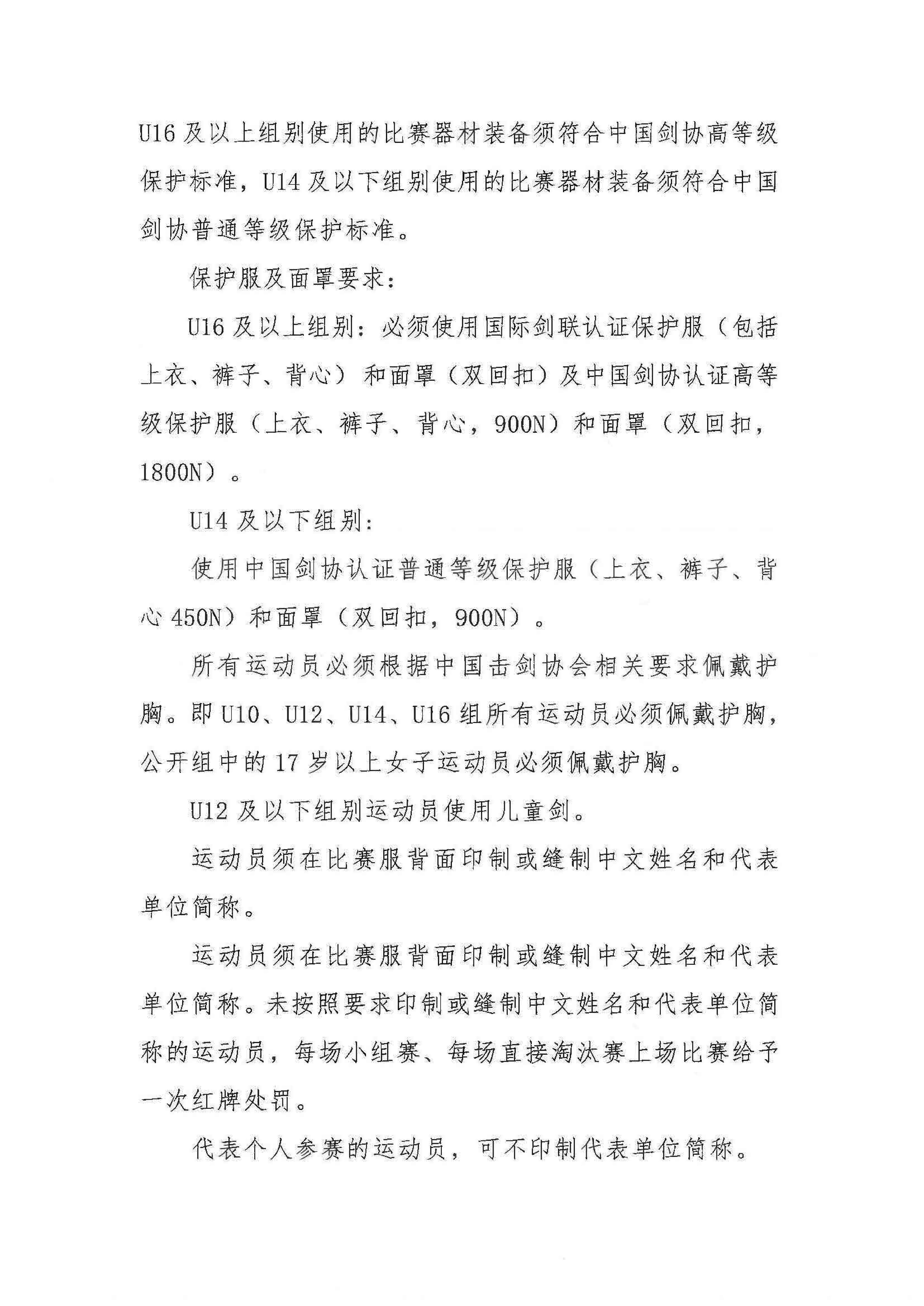 2.根据《中国击剑协会器材认证管理办法》相关规定,U16及以上组别使用的比赛器材装备须符合中国剑协高等级保护标准,U14及以下组别使用的比赛器材装备须符合中国剑协普通等级保护标准。